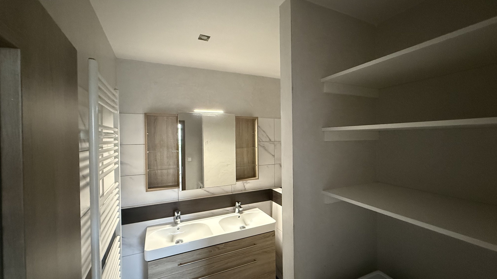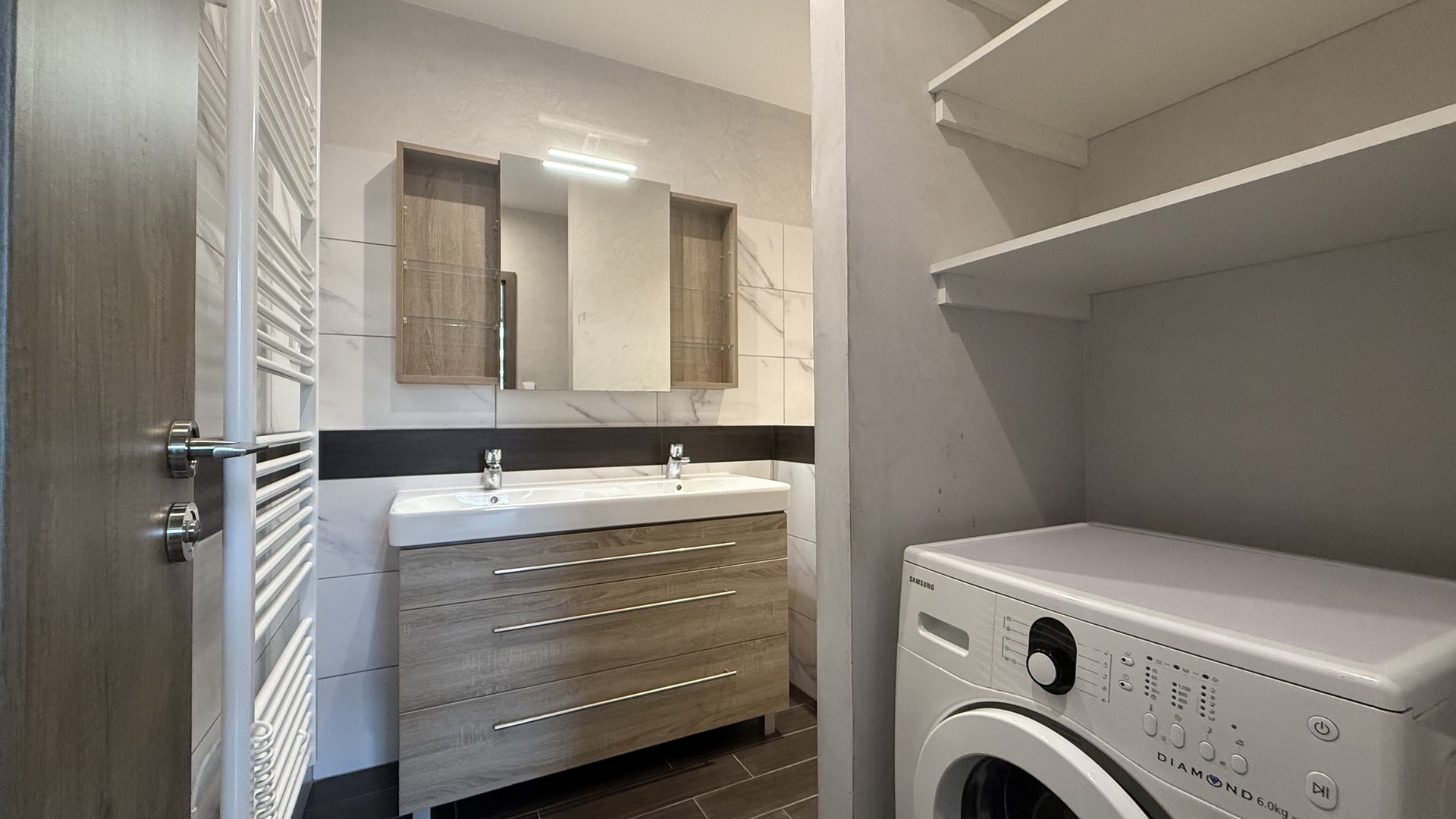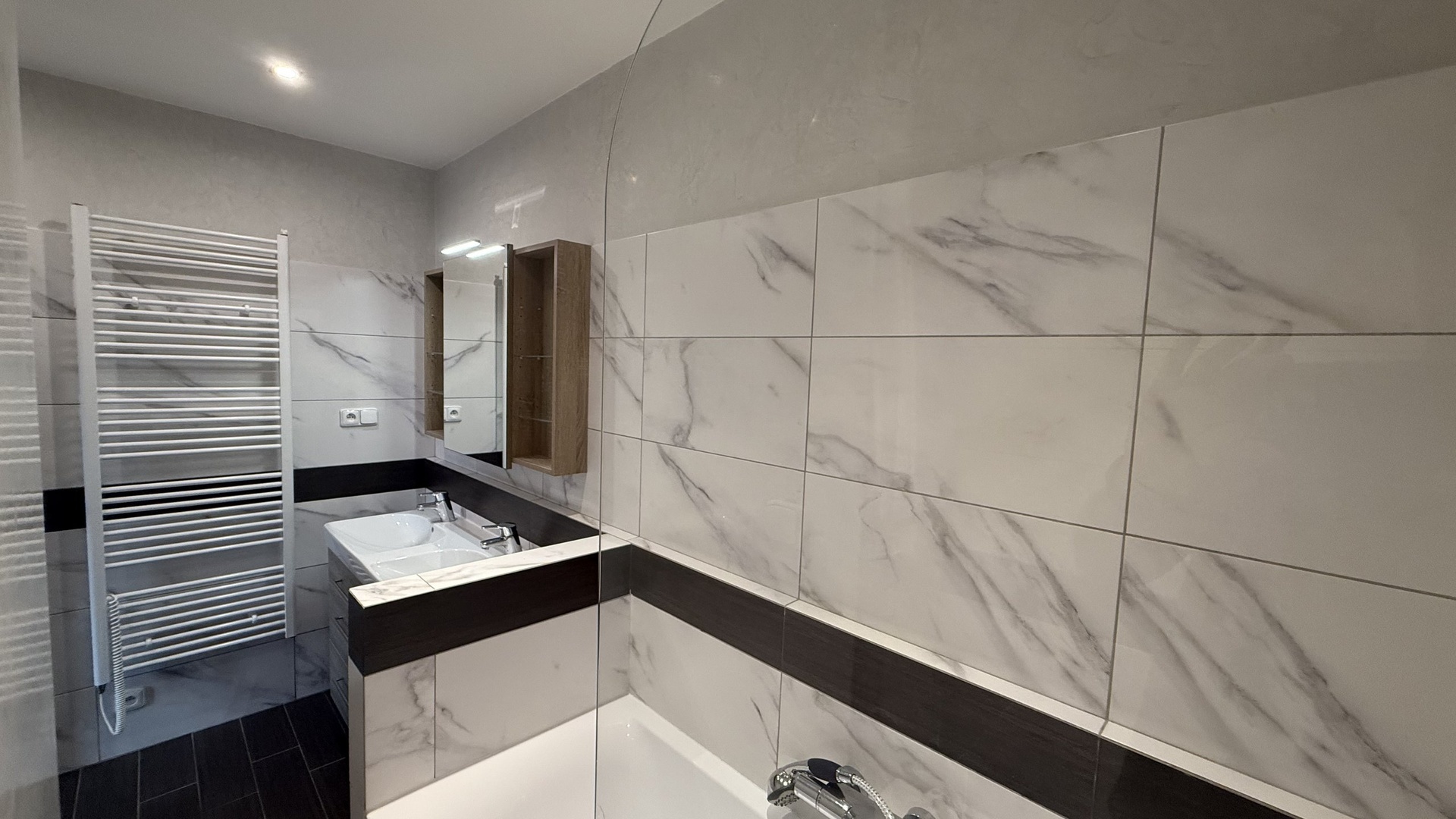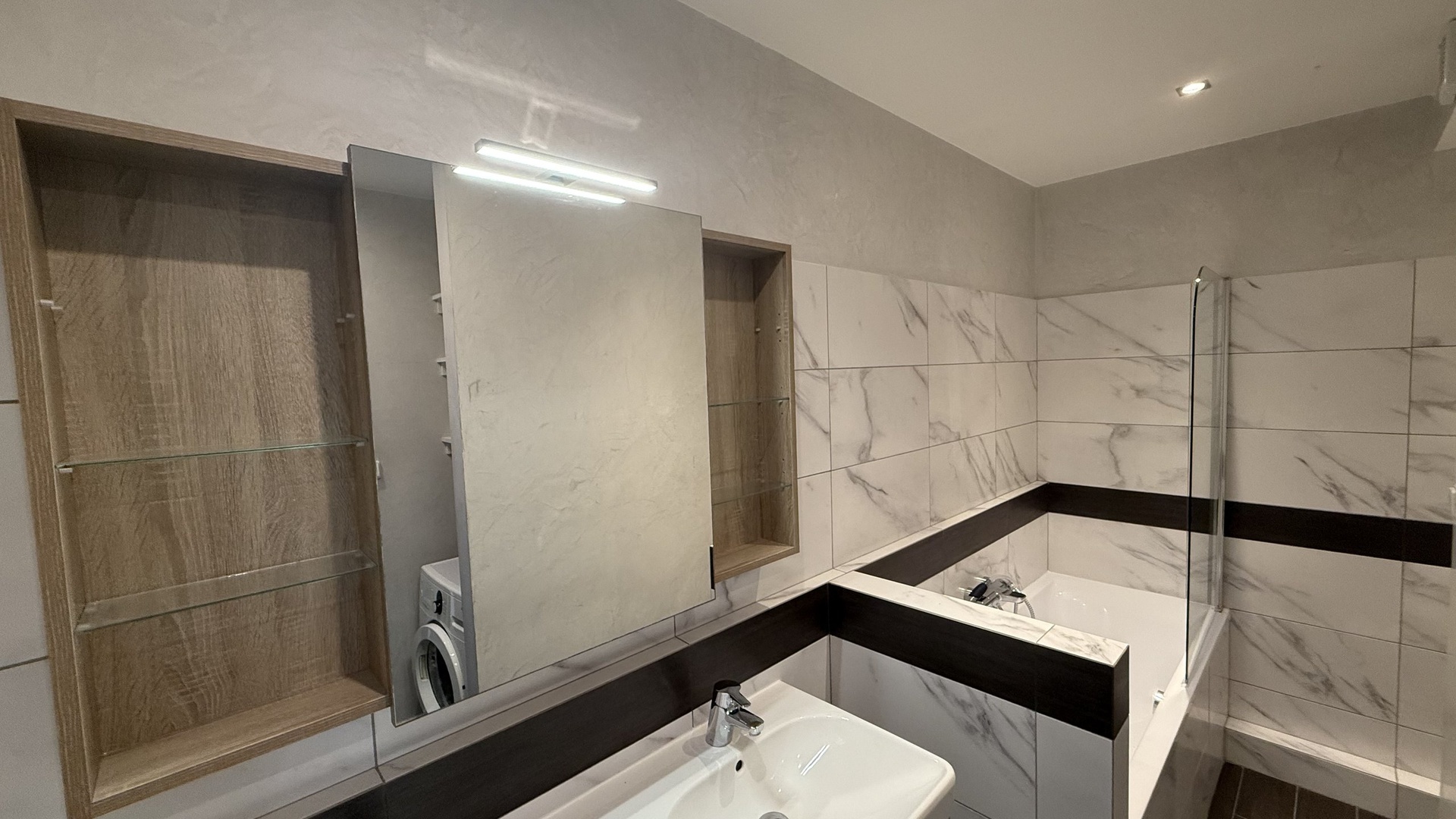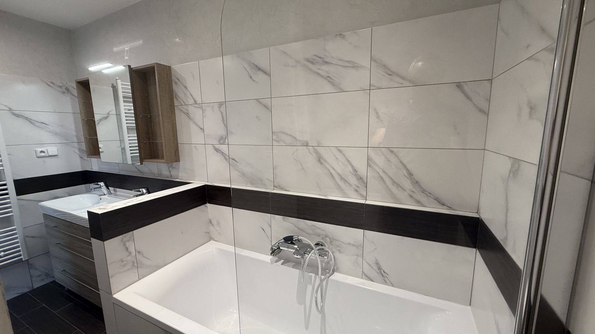 Na podlahách jsou keramické dlažby a v pokojích, kuchyni a jídelně pak vinylové krytiny. Dřevěné obložky a dřevěné dveře pak jen podtrhují velmi příjemný pocit z celého prostoru bytu. Všude jsou moderní úsporná LED svítidla.